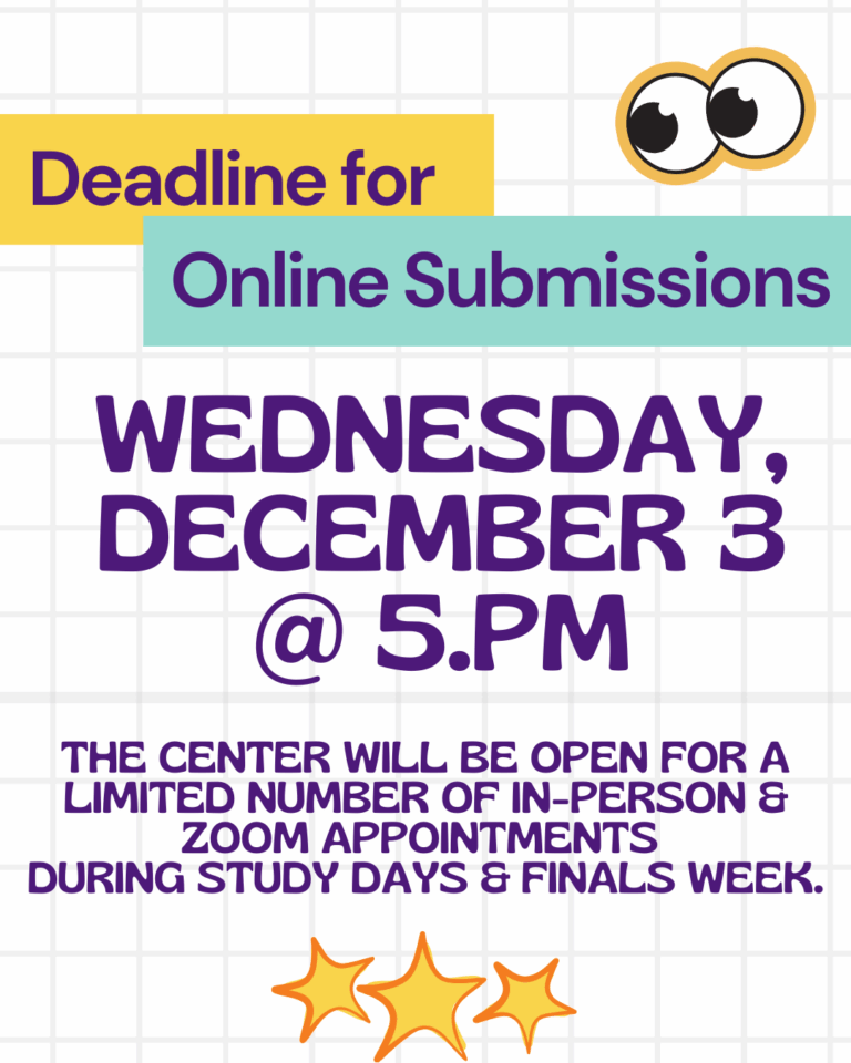 Thank you for visiting the Center for Writing! After completion of your consultation, please take a few moments to fill out a short satisfaction survey on your recent Center for Writing experience. We appreciate any feedback you can offer us. To complete the anonymous survey, click on the following link: Center for Writing Satisfaction Survey.